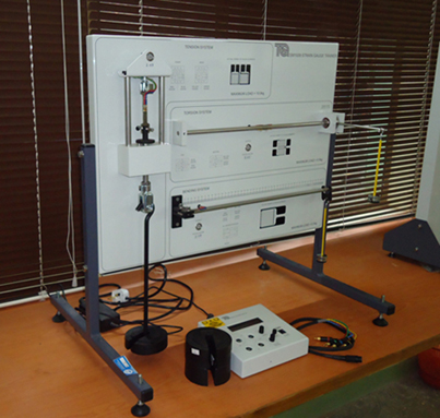 The strain gauge trainer shows how to measure strain in different ways and compare displayed strain with theoretical strain for different materials and structures.A digital strain display shows the voltage output from the strain bridge circuits and automatically calculates and shows strainI.It shows strain in the commonly accepted reading of microstrain(µε).